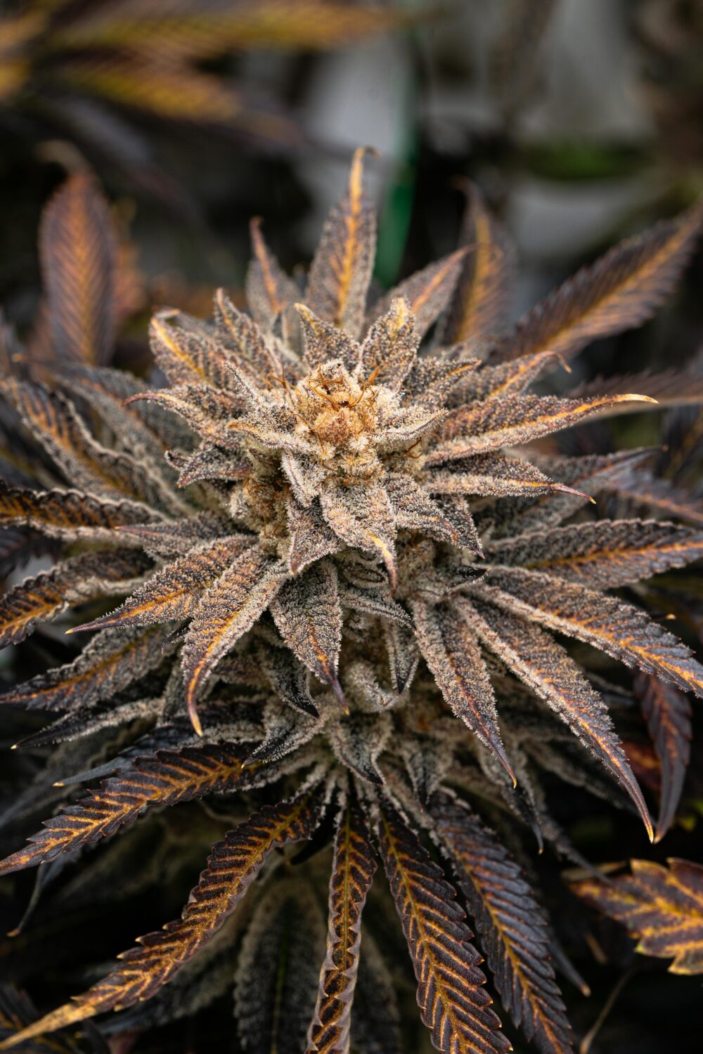 Cannabis flower with tightly stacked calyxes, a structure associated with high cannabinoid concentration